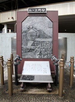 上野広小路口脇には、「あゝ上野駅」(作詞:関口義朗、作曲:新井英一、歌:井沢八郎)の歌碑が建っています。高度成長期の昭和30年から40年代に掛けて、当時金の卵と呼ばれた集団就職の若者たちが上野駅に降り立ちました。「どこかに故郷の香りを乗せて入る列車のなつかしさ・・」のフレーズに当時の集団就職の若者の故郷を想う姿が蘇ります。