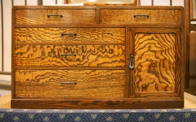 近年では、生活様式も洋式に変わってしまいましたので、このような箪笥がおける部屋も少なくなりました。そうすると、需要が無くなってしまいます。元来は寸法も決まっていましたが、最近では注文に合わせて製造するようにもなりました。やはり現代に合わせて変わらないといけませんね。三角形のコーナーに合わせてだとか、隅の形に合わせて製造するようにもなっていますね。指物でも、椚(くぬぎ)、桑、杉とそれぞれの得意分野があり、また需要もありましたが、今では需要も少ないと、何でも手掛けなければならなくなりました。