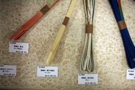 帯締めは、江戸時代後期に普及しました。歌舞伎役者が帯の上から締めた組紐(くみひも)の流行から始まったとも言われています。平たく組む「平組」、丸く紐状に組む「丸組」、杉の葉が並んだように組んだ八ツ組み紐を芯にした「角組」などを基本とした多様な表現があります。