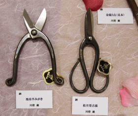 昔は、洋裁学校などでも、ずいぶんラシャ鋏などが使われていたのですが、最近では需要も無くなりました。これらは植木や花の剪定鋏ですね。 (右段に続く)