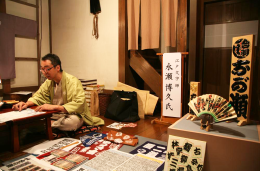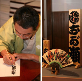 有從木制招牌店過來的業務,在大招牌•小招牌•敬奉匾額等上面刻寫人名或企業名稱。也在手巾和夏天穿得單和服上寫街道名稱或同好會的名稱,也設計日式棉襖上的徽章。在做扇子的紙上直接寫上字後制作出來,能夠表達的東西有很多。因為是寫在制作好的現成産品上的字,所以字體能夠保持原來的大小,不會因為縮小尺寸而使字體破壞。