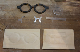 制作眼鏡的時候,先是做出眼鏡片的形狀。訂貨的時候批發商會拿來尺寸數據。用塑料薄板根據鏡片作出紙樣,鼻子和兩側的部分,然後用直棒作出上半部分和下半部分。做好之後沿著紙樣用線鋸切割材料。這時據出的材料是薄厚不均的,要用幾層材料粘起來把它補平才行。要作出所需的厚度,得先制作一些用作補充材料的配件,粘合的時用的是水、熱和壓力,不用膠類的東西。用板子夾緊壓它,在往一起連接的時候要先看底材,一邊透著光看,一邊考慮哪些地方怎樣做和顔色如何搭配。這個階段非常重要,需要格外小心避免造成浪費。