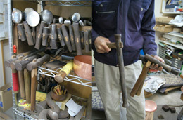 是啊,在燃氣普及以前,我們制作了很多的鍋和內爐等。曾經還有一段時期,制作的全部是燙酒銅壺,是一種用銅制鍍鎳的燙酒容器。鳗魚店裏用的稱做鳗銅壺,下面應該是有烤鳗魚的地方,熱量傳到旁邊的水箱把水燒開後用來燙酒。這種燙酒銅壺現在也已經改成不鏽鋼的用機械制造的了。不做燙酒銅壺了以後,好像就開始制作茶具和蛋卷平鍋等小器具了。從前一到夏天做燙酒銅壺的工作比較閑的時候,才會制作一些這樣的小東西,現在卻以制作這些爲主了。