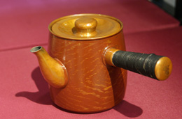 自古以來人們就在日常生活中使用銅器。現在,用鑄造法把溶化後的銅澆進鑄型裏來制造佛像和寺院的吊鍾等銅制品的高岡(富山縣),和鍛造法用鐵錘敲制成形法來制造鍋和水壺等制品的燕(新瀉縣),這兩大産地最爲有名。江戶銅器采用的制作方法屬于後者,是用鐵錘敲制出來的。拿銅鏽用煮色法把銅器染成暗橘黃色的獨特手法,可以說是傾慕風雅的江戶所獨有的吧。