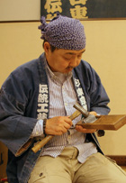 收尾工作,主要是爲了避免木紋逆向的情況,要修平然後上色。因爲木頭上有木紋,不是隨便從哪邊開始削都可以的。上色分幾種方法,做成黃色的叫“抛光粉加工”,是從前就有的一種上色技法,其他還有用火燒之後進行打磨的方法。把上色前的木材用噴燈燒一下,然後用銅刷子把碳黑層刷掉,之後再上色。上色的方法與其說是塗抹,不如說是把顔色擦到木紋中去,顔色上的可偏深些,然後用刮刀去處理,再做上防水處理和打蠟等幾道工序去完成。
