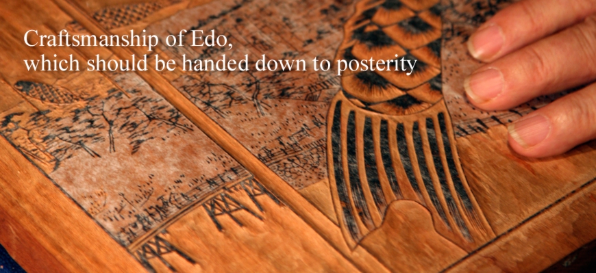 First of all, I turn a picture back, and past it on a woodblock. Then, after shaving the picture and making it thin, I engrave the top side of the woodblock. Once all lines are engraved by using a knife, the surrounding part is engraved by using a gouge. I also hammer the gouge. So I need to hold a desk by my feet so that the desk does not move. I use both my hands and feet. Then, I remove unnecessary parts using a flat chisel, and finish it using a chisel. This is the process to engrave a woodblock.