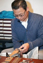 First of all, I draw a pattern, and carve it out. Next, I use a file for scabbling shells. The file is called "Gangiri" and only used by tortoiseshell workers. To begin with, I remove scratches on the surface with Gangiri. Then, I remove scratches made by Gangiri with a penknife, and polish the shells with horsetail leaves after sandpapering them. After that, I press them using heat and water.