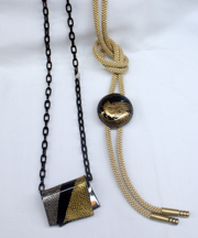 (Left: Gold lacquered tortoiseshell product that serves both as a pendant and an ornamental clasp / Right: Bolo tie with a clasp decorated with the makie technique)