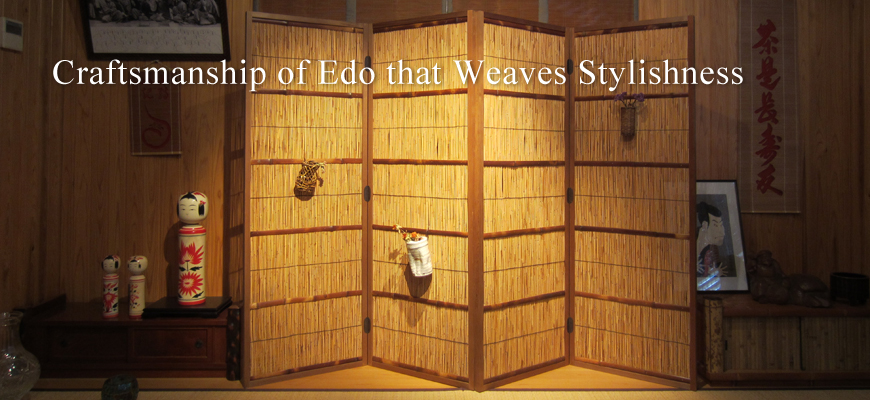 Bamboo blinds were themes of some tanka poems in "Manyo-shu," the oldest anthology of tanka poems, and have been used as furnishing goods in the Court, shrines and temples. In the Edo Period, as many people came to Edo from provinces, bamboo blinds were widespread among commoners, and a variety of Edo-style bamboo blinds were produced out of necessity.