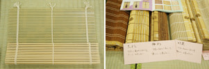 Basically, I make anything that customers want. Bamboo blinds fall into 4 general categories. "Sotogake Sudare" is hung outside of a house for keeping off the sun or as a screen. "Uchigake Sudare" is used in Japanese-style rooms, shrines and temples. Nowadays, it is sometimes hung on windows. There are also small bamboo mats, which are used for making a sushi roll or used as "Banju," or mat on which Japanese-style confections are put. I have also recently made table covers and coasters out of bamboo. Finally, there are applied bamboo blinds, including ones that are put on folding screens or sliding paper doors. Some customers ask me to make bamboo blinds that can be put on their crafts. Those special bamboo blinds are sometimes ordered.