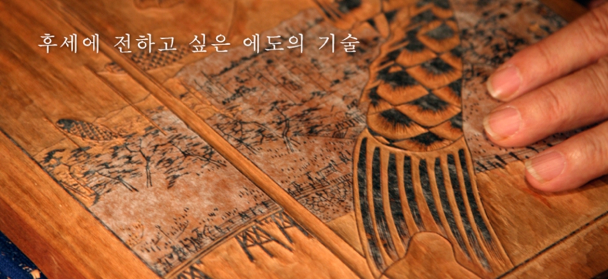도안을 뒤집어 판에 풀로 붙이고 밑그림을 얇게 벗겨 낸 다음 표면을 조각해 갑니다. 우선 조각도로 선을 전부 파낸 다음 둥근 칼로 주변을 깎아냅니다. 바로 옆을 망치로 두드리므로 작업대가 움직이지 않도록 다리로도 누르고 있지요. 그러니 다리도 손도 모두 사용하는 셈입니다. 그런다음 평 칼로 불필요한 부분을 깎아내고 마지막은 끌로 마무리합니다. 이것이 일련의 작업입니다.