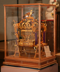 세상에 하나뿐인 미니 미코시(신여). 미코시 제작에는 목공, 금속세공, 매듭, 금박, 옻칠 등 일곱에서 여덟 업종의 장인이 관여한다. 본 미코시 제작에는 약 20년이 소요되었다. 대좌는 6자 크기인 실물의 10분의 1인 약 18cm이다.
