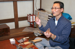 예전에는 기계가 없었기 때문에 광을 낼 때 사슴 가죽을 사용해서 오랫동안 연마했다고 합니다. 접착도 계란 흰자를 사용했다는군요. 화로 등을 인두 대신으로 열을 조절하면서 붙였다고 합니다. 최근에는 장신구로 브로치, 펜던트, 목걸이 등 서양식의 제품이 인기가 있습니다. 책갈피나 페이퍼 나이프 등은 생각이 나서 만들어 본 것입니다. 주문이 있으면 무엇이든 만들지요. 여태까지는 수염을 다듬는 빗이나 향통, 묵주 등의 주문이 있었습니다.