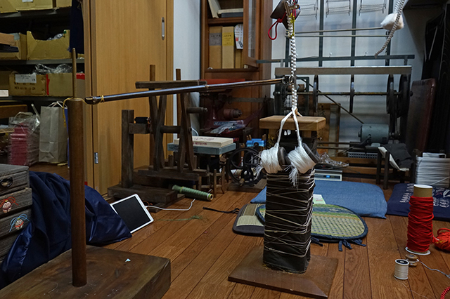 利用方台編制組紐,正在編制大型的羽織紐。