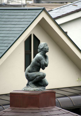 A plaster master of Statue of Rentaro Taki (its bronze statue is set up in front of the entrance of Sogakudo of the Former Tokyo Music School that was relocated to the grounds of Ueno Park) is placed in the studio. The right female statue was made into a bronze statue that is now placed on the roof of the former studio, facing to rows of houses in Yanaka.