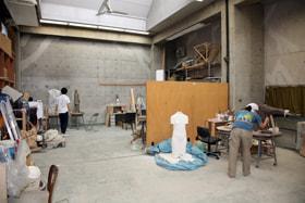 聽深井教授說,學生的作品沒有固定要求,可以任意作自己喜歡的東西。碩士研究生有畢業作品展,作品展示在大學美術館和這個工作室裏,因為在大學美術館裏展示雕刻作品的空間比較狹窄,作品在制作時限定于一個房間內能夠放得進去的尺度,用一年的時間去制作完成。那些大到房間內都擺不進去的作品,只好展示在室外和大學美術館前。學生們雖屬于不同的研究室,但是工作室不分你我可以共同使用。深井老師的專業是木雕,在他的研究室裏,有從本科3年級到博士生,石雕和金屬的研究室也是一樣的情況。但是在塑像專業情況略有不同,碩士研究生和本科生在不同的房間進行創作,2年級後期課程開始有選擇實習課,有7成的學生使用的是規定素材。在日本,從素材上定向的比例比較高,已經形成了這樣的一個教育體系。 (下段繼續)
