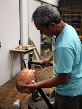 聽筱原教授說,鍛金技術分熱加工和冷加工,前者是把鐵燒紅後進行鍛造,後者是將退火後變軟的銅板進行的冷加工擠榨技法。其他比較傳統的還有著色法,就是用硫酸銅和銅綠的水溶液煮上顔色的煮色著色法,和把不同的金屬板層積接合,一邊削出紋樣,一邊敲打拉長的木紋金等技術。