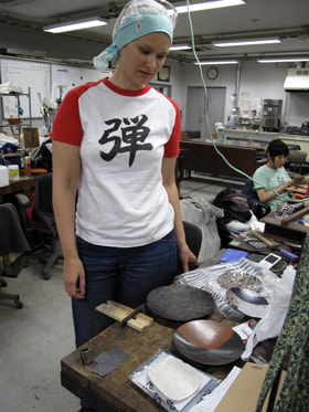 筱原教授親自為我們展示了鍛金技術的不可思議之處,隨著錘子巧妙的揮動錘打,銅板像具有生命的一樣隨即變形。從愛沙尼亞來的碩士研究生卡高拜勒•昂尼,在本國主要從事制作珠寶首飾。而歐洲比較有人氣的是木紋金(銀、銅、赤銅、黃金等層積接合後一邊削出紋樣,一邊敲打拉長的日本傳統技法)。很多人來到日本本土留學學習這項技術。現在在制作容器和裝飾品,珠寶加工和鍛金工藝上雖然從作品的構思上存在著差異,但從愛沙尼亞的時候起他就懷有始終不變的主題。日本和歐洲在表現上存在這不同,是件很有意思的事情。(下段繼續)