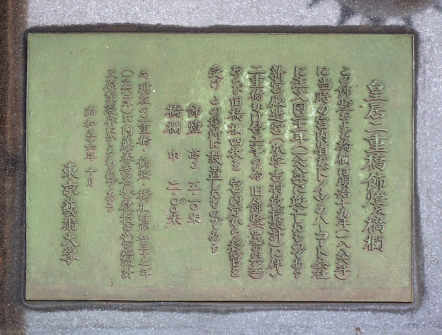 The control of the former streetlamp and parapet, which is now placed in front of the Chinretsukan Gallery, was transferred from the Imperial Household Agency when the former streetlamp and parapet of the Double Bridge was replaced with the present ones (designed by Professor Emeritus Haruji Naito) as the new Imperial main palace hall was constructed in 1962. The former streetlamp and parapet was made by Harkort'sche Fabrik, a German steelmaker, in 1888.