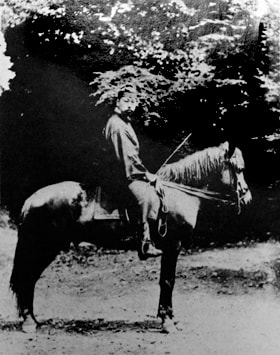 Kakuzo (Tenshin) Okakura sitting astride his horse "Wakakusa-go"