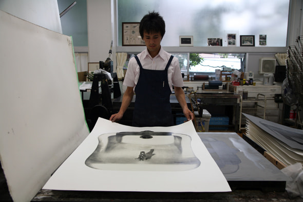 According to Professor Azumaya, undergraduate and graduate students create their works in the same room. He said that there are Lithograph, Copperplate Print, Woodblock Print and Silk Screen courses, and that Tokyo University of the Arts is the only university that has the 4 printmaking courses in Japan. Although limestone called Lithographic Limestone is basically used to print lithographs, students frequently use aluminum plates because large prints can be printed by using them. Professor Azumaya also said that very large prints have recently increased.