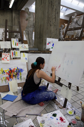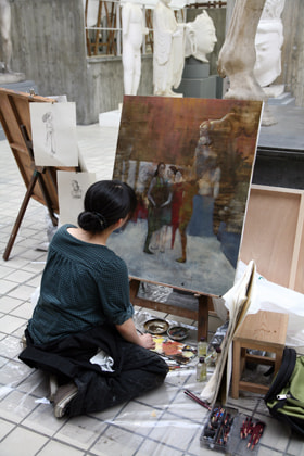 美術学部の象徴ともなっている大石膏室では、「再入試」と題された油画の授業が行われていました。林立する石膏像の空間の中で赤・青・黄・緑色のコスチュームを着た女性が、寄り添う、佇む、繰り返す、動く、集合する光景を描くという課題で、学生は5週間を掛けて石膏が置かれた空間と人体の有り様を表現していました。この授業を受けていた学生は、入学試験でも人物の存在する空間を描いており、「再入試」は、学生にとっては再び入学試験の際の緊張感や記憶が蘇るもののようでした。坂田教授のお話では、学生の多くはこれまで静止したものを描いてきているので、この授業は石膏室という空間でそれぞれ異なった動きをしているモデルの姿や絵画表現の基礎となる色彩に着目して、光・色の三原色と人物を組み合わせて描かせる試みであるとの事でした。