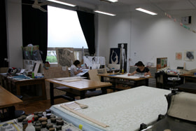木版やリトグラフの制作に取り組んでいる学生たちは、静かで落ち着いた工房で、制作の手だけが忙しく動いていました。