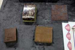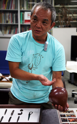 篠原教授のお話では、鍛金技術は熱間加工、冷間加工があり前者は鉄を熱して赤い状態で加工する鍛造、後者は焼き鈍しして柔らかくなった銅板などを冷間で加工する絞り技法などがあるそうです。その他に伝統的なものでは着色法として硫酸銅と緑青の水溶液で煮て色上げをする煮色着色や、異なる金属板を積層して接合し文様を削り出しながら打ち延べて行く木目金などがあるとのことでした。