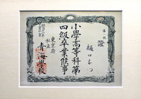 搬家到上野禦徒町後,在就學的池之端私立青海學校小學高等科4年級的畢業證書(明治16年(1883)12月),以第一名的成績完成學業。(山梨縣立文學館藏)
