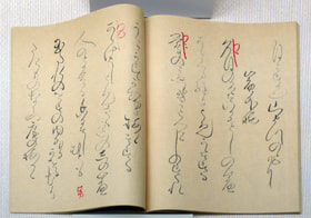 《咏草》(明治24年(1891)12月开始25年(1892)8月的作品),共15页。文中的红笔批注和订正是主办歌塾[萩的舍]的中嶋歌子的笔跡。