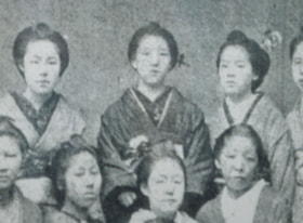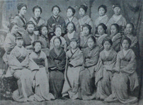 明治20年(1887)2月[萩的舍]建會的紀念照片,後排左數第三人是一葉,第2排中央是中嶋歌子。(山梨縣立文學館藏)