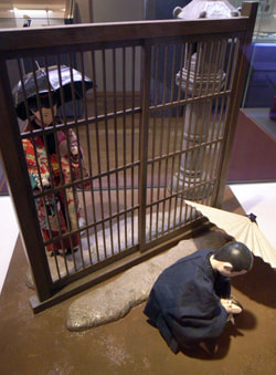 《青梅竹马》中的美登利和信如,正在换木屐带的信如和手里握着红丝友禅染布伫立着的美登利