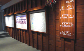 An information board, which looks like a warm wooden wall of a town house, reminiscent of that of Ryusenji-machi, hangs at the entrance of the Ichiyo Memorial Hall.