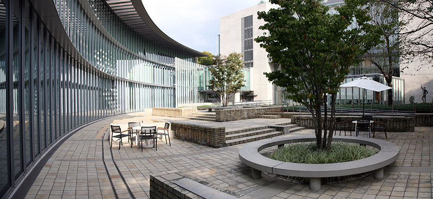 國際兒童圖書館的中庭,新館(彩虹棟)的玻璃壁面形成壯觀的弧線。