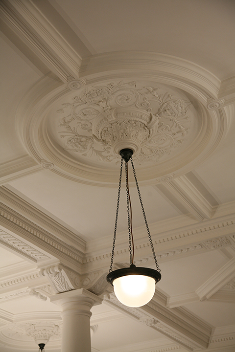 아동서 갤러리의 4개의 원기둥은 철골에 대나무를 엮은 ‘다케코마이’를 감아 회반죽으로 마감한 것입니다. 기둥의 장식은 석고 틀에 회반죽을 채우고 굳기 전에 틀에서 뺀 후 부착하는 공법이 사용되었습니다. 또한, 천장 장식은 미장 장인이 흙손으로 그린 릴리프로 만들어졌습니다. 복원할 때에는 당시와 같은 방식으로 이루어져 그 기술이 이어지고 있습니다.