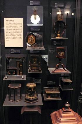 This is the exhibition of Japanese clocks. Specially structured clocks are needed for the temporal hour system because the length of the basic time unit varies according to day, night or seasons. Japanese clocks have a mechanism that can properly display the irregular time. So, Japanese have had very sophisticated technologies since early times, and applied them to their lives. These Japanese clocks prove Japan's technological level at that time. In the Meiji Period, the irregular time-measuring system was abolished, and the regular time-measuring system was adopted, so Japanese clocks cease to be used. However, production of new mechanical clocks started. Since then, the clock industry in Japan has developed significantly, and become the world's leading industry.(continued in the lower left column)