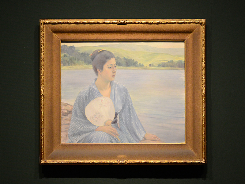 A painting depicting Teruko, a woman who got later married with Kuroda, at a lakeside of Lake Ashi in Hakone where he visited for spending summer. Although this painting is widely known as "Lakeside," it was submitted to the 2nd Hakubakai Exhibition in 1897 under the title "Summer Resort." It was also exhibited at the International Exposition in Paris in 1900 along with "Wisdom, Impression, Sentiment."