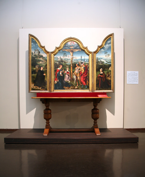 16世紀前半のアントウェルペンではヨアヒム・パティニールとヨース・ファン・ファン・クレーフェが活躍しました。パティニール派は、キリストの遍歴が壮大な広がりの風景として描き、クレーフェの作品では、三連の一続きとなった風景の中に、パネル中央にキリスト磔刑像を描き、跪いて礼拝する祭壇画の寄進者夫婦を両翼のパネルに描いています。