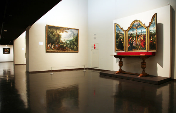 14-16世紀の絵画コーナー(本館2階) / ヨース・フアン・クレーフェ「三連祭壇画・キリスト磔刑」(16世紀初頭、右)、ギリス・ファン・コーニンクスロー「『パリスの審判』が表された山岳風景」(16世紀末-17世紀初頭、左)