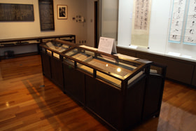 中村不折纪念馆一层的第一展示厅的大型展示柜里,展示著竖长型的作品。