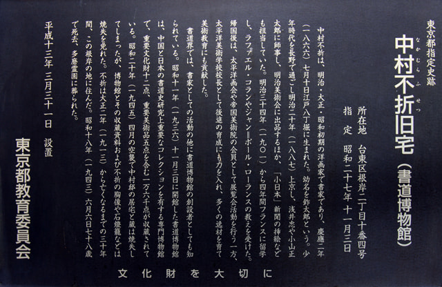 다이토구립 서도박물관은 중국 및 일본의 서도사 연구상 중요한 컬렉션을 소유한 전문 박물관으로서, 이는 서양화가이자 서도가였던 나카무라 후세츠가 그의 반생 40년에 걸쳐 홀로 수집한 것입니다. 서도박물관은 개관 이래 60년에 걸쳐 나카무라가문에 의해 유지 보존되어 왔습니다만, 1995년 12월에 다이토구에 기증되었습니다. 그리고 2000년 4월에 다이토구립 서도박물관으로 재개관되었습니다. 기존 건물인 본관과 기증 후에 새로이 지어진 나카무라 후세츠 기념관으로 이루어집니다. 동관은 나카무라 후세츠 구 저택으로서 동경도 지정 사적으로 지정되어 있습니다 (다이토구 네기시 2-10-4).