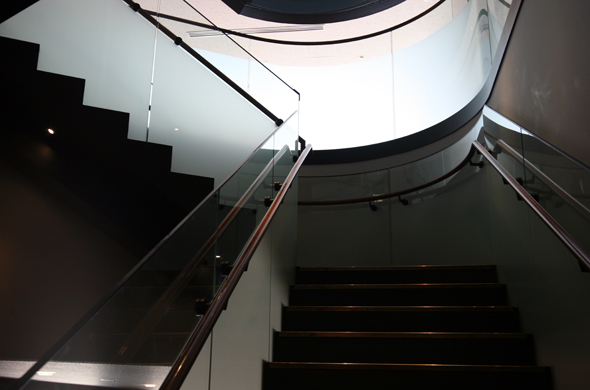 Spiral staircase leading from the lobby floor (the first basement) to the first and second floors