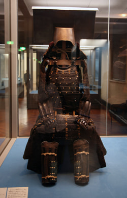 白絲威一的谷形盔(左面陳列的展品),德川家康將其傳給作為第一代水戶潘主的兒子賴房(注:德川賴房是德川家康的第11子,1603-1661)。(右面陳列的展品)黑韋素懸威的如意頭形盔,類似蝶形或葵葉形,也象佛教用具中如意的雲形。