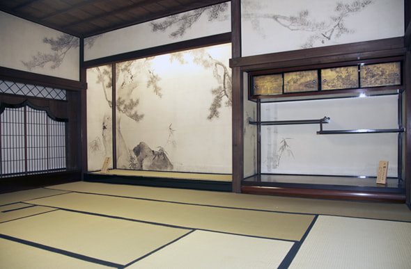 在昭和9年(1934)由九条道秀捐赠,东京赤坂的九条侯爵府邸移建过来的。地板上贴的是用狩野派的着色手法绘制的山水图,柱栏之间用一整张雕透着藤花菱的花梨板装饰而成。