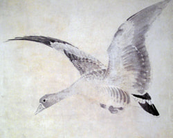 在芦池上,对大雁翩然飞落而下的样子金星了细致入微的观察,并运用远近法描画出来的。