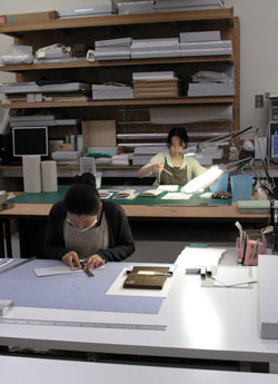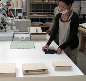Kanba : This is another repair room. One of the tasks to be performed here is to make a variety of storage boxes like these. There are many types of boxes. We have made appropriate boxes and mats in accordance with a variety of documents, Japanese books and Ukiyo-e, which are stored in this museum. Ms. Yonekura is in charge of the tasks.