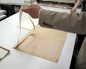 Yonekura : These are special storage boxes for Japanese books. Pieces of "Inpu," a collection of seal impressions gathered into book form, of various sizes have been stacked in storage boxes. In order to prevent a bottommost book from being damaged by the pressure of weight of upper boxes, these boxes were created. These projecting parts inside a box absorb the weight of upper books. Since the weight does not directly put pressure on lower books, books can be stored in a natural state. A flap is attached to a box in order to prevent dust and insects from entering the box. Depending on book conditions, we also make a box with cushions inside it. The inside of this cushion is cotton, which is wrapped by wrinkled Japanese paper. The cushion protects damaged edges of a book, so the book can be safely stored as it is.