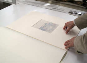 This piece is properly framed with a mat. Ukiyo-e will be exhibited in this form. A sandwich-shaped mat is placed under a top window mat. If there is no sandwich-shaped mat under a window mat, the window mat directly presses the paper. Actually, when Ukiyo-e is stored, 10 pieces of it are stacked. The bottom piece receives the weight of nine pieces of Ukiyo-e. If the paper is pressed with strong pressure, there is a possibility of making a depressed line at edges of the paper. In order to avoid it, another mat is inserted between a window mat and the paper. Therefore, the top window mat does not come into contact with the paper directly. Since each piece is carefully finished, it takes a lot of time. Sizes of window mats vary. Mats should be made to suit each piece of Ukiyo-e so that the edges of the mat slightly overlap the paper. Mats are cut by a tool called "mat cutter" that is controlled by computer. We use that tool to cut out window mats. (continued in the upper right column)