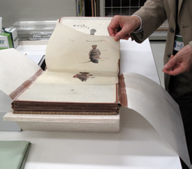 Kanba : This case was designed by the staff of this museum in order to store books. Although this album was made in the Meiji Period, it is fairly dated and damaged. We are inclined to think that it is better to replace the old paper with new one when repairing it. However, this is the important album from the Meiji Period. The book form itself is meaningful, and the album has not deteriorated. It can be properly used if repairing it. Also, the repaired one is better because its historical value still exists in it. So, we are planning to store it while maintaining its present state. (continued in the lower column)