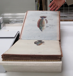 Kanba : This work was done by French restorer Valery Lee. These are a kind of album called "Gyofu." It is an illustrated book of fish, created in the late Edo Period. One of the illustrators who drew the pictures of fish is Yuichi Takahashi. It can be called the Tokyo National Museum version of an illustrated book which was created by cutting and pasting a variety of fish drawings. If a person, who does not know the structure of "Gyofu," flip through the pages, the paper of the book might get turned up. So, in order to ensure handling safety, these pockets are attached to necessary places. Also, it takes a lot of time to repair all wormholes, so we have applied "minimum treatment" in which minimum necessary repairs are conducted.